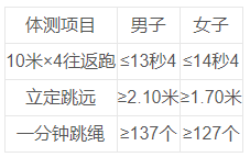 2、体能测评参考《关于印发<公安机关录用人民警察体能测评项目和标准>的通知》(公政治〔2024〕60号)规定执行,结合公安工作实际需要,体能测评内容为10米×4往返跑、立定跳远、一分钟跳绳(体能测评采取通过式、单项测评次数不超过两次),以上体能测评项目采取“三选二”的模式,由考生自主选择,具体合格标准如下: