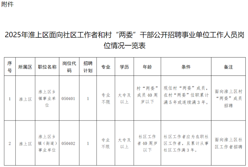 附件:《2025年淮上区面向社区工作者和村“两委”干部公开招聘事业单位工作人员岗位情况一览表》