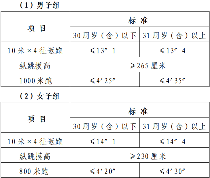 笔试成绩评定后,分别按照不同岗位招聘计划1:1.5(四舍五入)或1:2的比例,根据笔试成绩从高分到低分的排序确定体能测试人选。最后一名体能测试人选的笔试成绩如出现并列者,同时参加体能测试。体测标准,根据《公安机关录用人民警察体能测评项目和标准(暂行)》,具体参照《公安机关录用人民警察体能测评实施细则》执行。