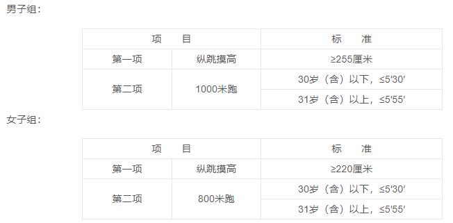 体能测评对象在规定时间内参加体能测评,未按规定时间参加体能测评的人员,视为自动放弃体能测评资格。体能测评成绩不计入总成绩,体能测评不达标者不得进入面试。具体测评项目和标准如下: