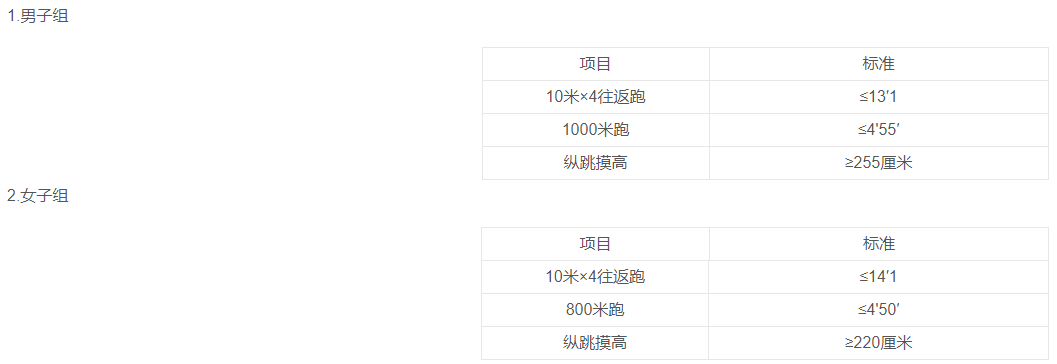 参照《公安机关录用人民警察体能测评项目和标准》《公安机关录用人民警察体能测评实施规则》执行。测试项目为:10米×4往返跑、1000米跑(男)、800米跑(女)、纵跳摸高,测评标准如下: