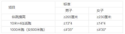 体能测评参照《公安机关录用人民警察体能测评项目和标准》《公安机关录用人民警察体能测评实施规则》执行。体能测评项目为:纵跳摸高、10米×4往返跑、1000米跑(女800米跑),测评标准如下表: