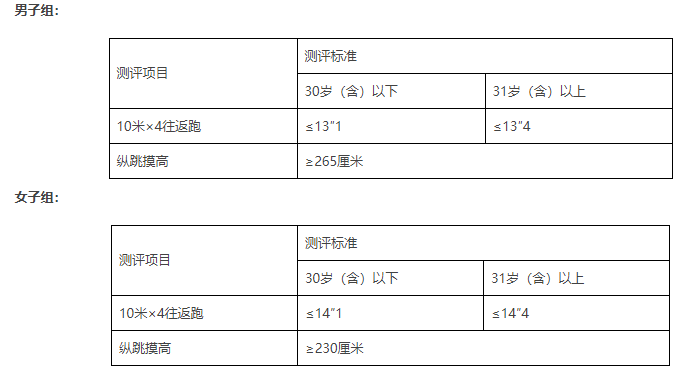 3.测评内容:测评包括两个项目,分别为纵跳摸高、10米×4往返跑,每个项目测试次数不超过2次。体能测评采用达标制,任意一项不达标的,即为体能测评不合格,不进入下一环节。体能测评不设缓测、补测。测评标准(年龄计算时间截止到体能测评当月)如下: