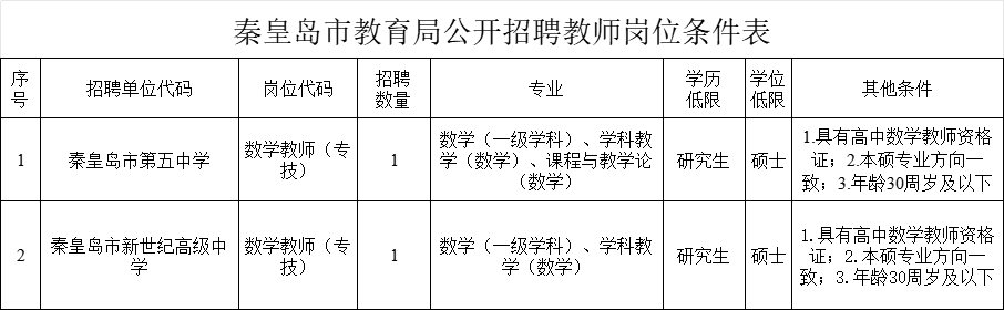 5.秦皇岛市第五中学等2所学校公开招聘教师,岗位要求详见《秦皇岛市教育局公开招聘教师岗位条件表》(附件1)。