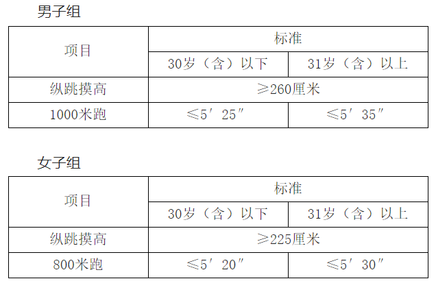 2.体能测试项目及标准参照公安机关录用人民警察体能测试相关标准执行。体能测试项目包括纵跳摸高、中长跑(男1000米、女800米)。二项均为达标项目,其中一项不合格,即为体能测试不合格,不再进行下一个测试项目。体能测试不合格的不得参加面试。