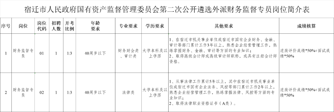 宿迁市人民政府国有资产监督管理委员会第二次公开遴选外派财务监督专员岗位简介表