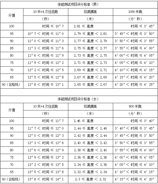 04体能测试报考勤务辅警人员需参加体能测试,参考公安机关录用人民警察体能测评项目和标准进行,测试项目包括:10米×4往返跑、纵跳摸高、1000米(男)/800米(女)跑,根据各项目评分标准进行赋分(评分标准附后)。每个项目设置合格线,参加测试人员三个项目中须有任意两个项目达到合格线,否则即视为体能测试不合格,无面试资格。在此基础上,报考巡特警岗位人员的三个项目得分平均数将折算入总分,报考其他勤务辅警岗位人员任意两项达标即可。体能测试期间,非因伤病原因,任一单项弃权者无面试资格。