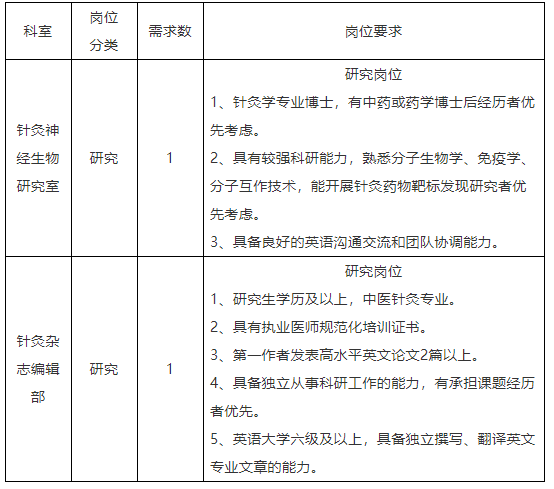 针灸神经生物研究室研究人员,职数1名;