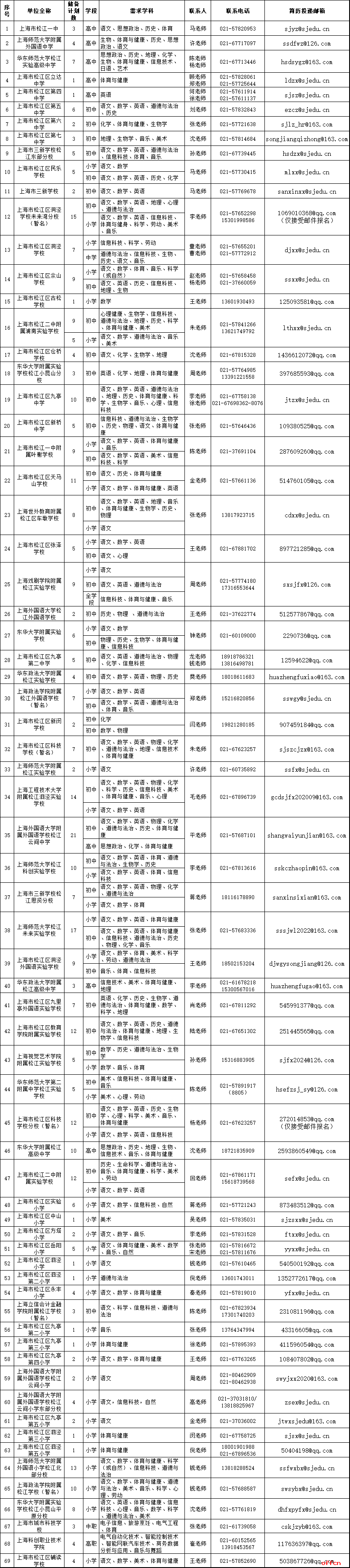 上海市松江区中小学与中高职事业编和储备教师。具体需求类型、岗位名称及招聘计划数等信息见附件。