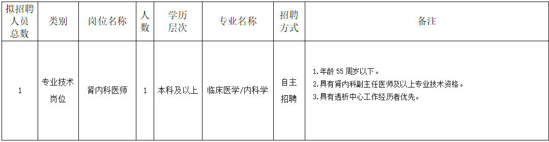 现面向社会公开招聘1名肾内科医师
