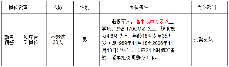 为进一步充实公安基层工作力量,强化退役军人服务保障,根据《中华人民共和国退役军人保障法》、《四川省公安机关警务辅助人员管理办法》,雅安市公安局雨城区分局(以下简称区公安分局)会同雅安市公安局交警支队(以下简称交警支队)、雅安市退役军人事务局(以下简称市退役军人事务局)面向全市退役军人招聘警务辅助人员(以下简称“辅警”)30名(不超过),现将招聘有关事宜通告如下: