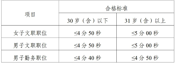 体能测试项目为女子800米跑、男子1000米跑。体能测试合格标准见下表,测试次数只有1次。