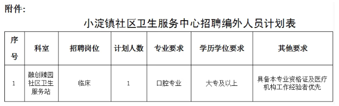 具体招聘的岗位、人数和条件详见附件《小淀镇社区卫生服务中心招聘编外人员计划表》