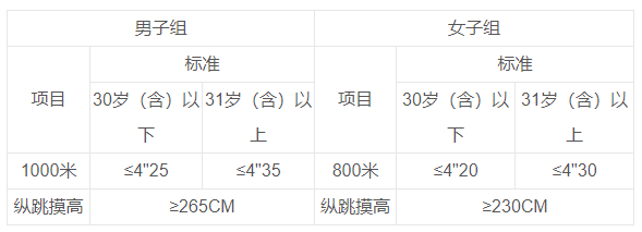 体能测试参照《公安机关录用人民警察体能测评项目和标准》开展,项目包括男/1000米、女/800米和纵跳摸高两项。