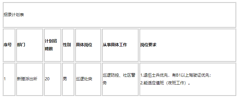 计划面向社会公开招聘警务辅助人员20名。具体招聘岗位、招聘计划等要求详见附件1。