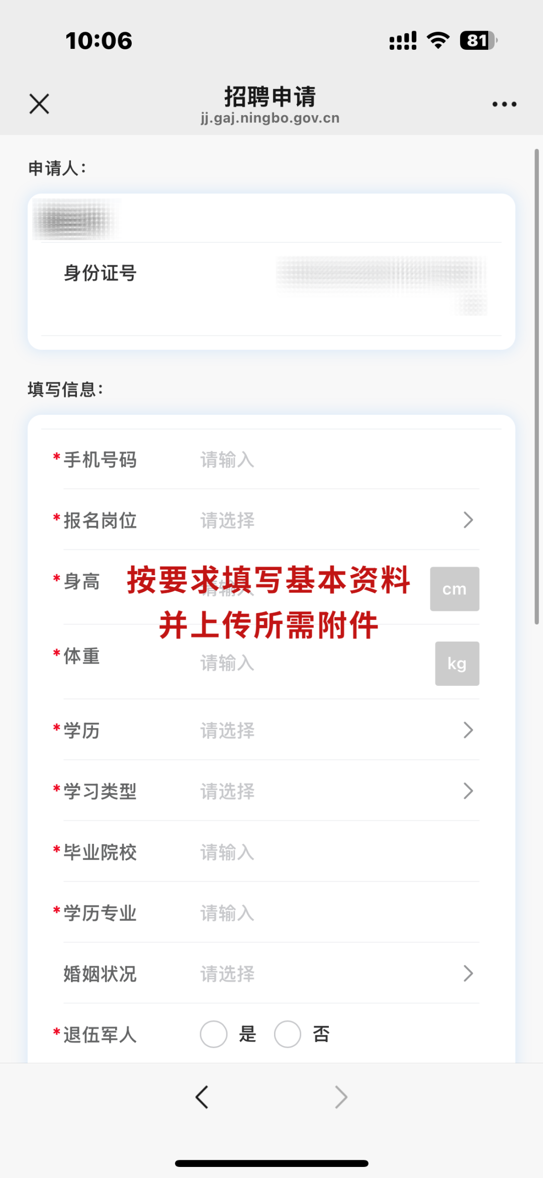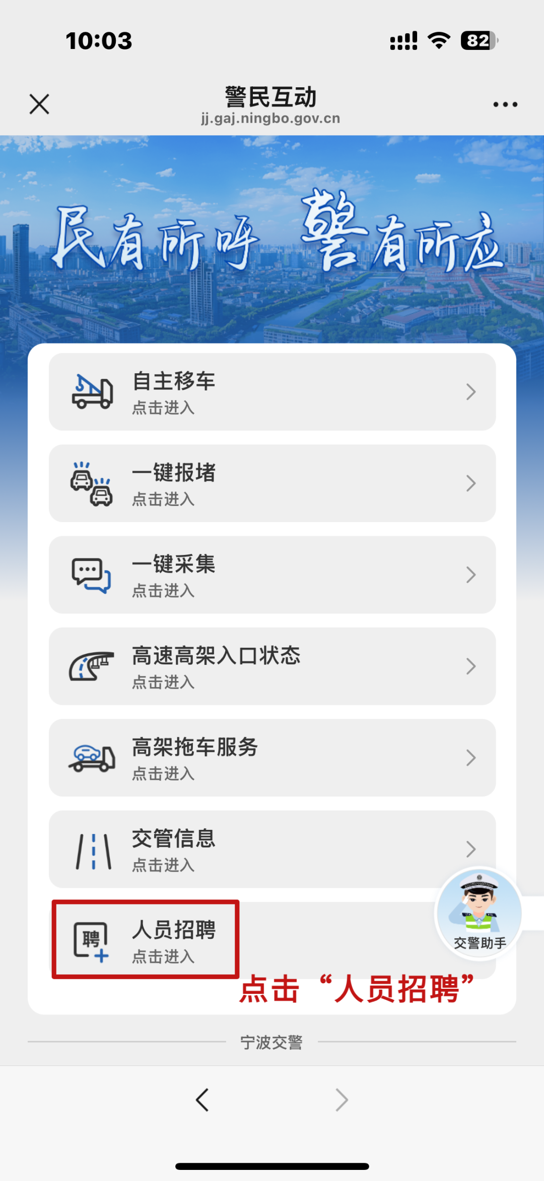 1.线上预报名:关注“宁波交警”微信公众号,在个人中心实名认证,进入“警民互动”板块,点击菜单最下面“人员招聘”,按要求填写基本资料并上传所需附件。审核结果会在5个工作日内完成并短信通知。每人限报一个岗位,注明是否接受岗位调剂。