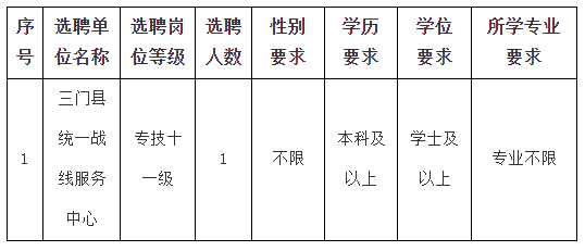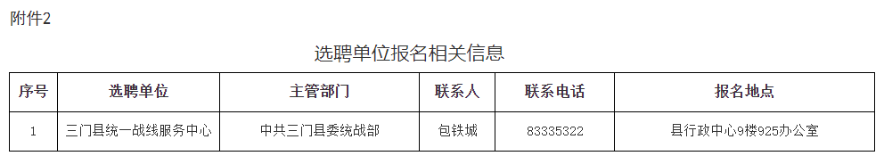 因工作需要,中共三门县委统战部下属事业单位三门县统一战线服务中心决定在全县范围内选聘财政全额拨款事业编制工作人员1名。现将有关事项公告如下:
