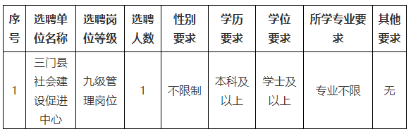 因工作需要,三门县发展和改革局下属事业单位三门县社会建设促进中心决定在全县范围内选聘事业编制工作人员1名。现将有关事项公告如下: