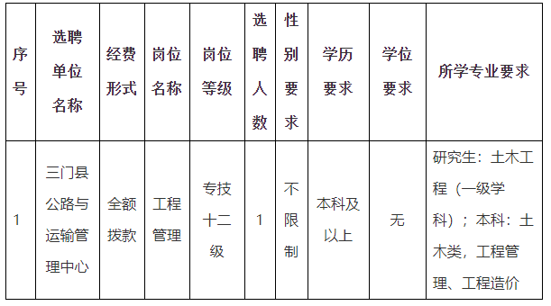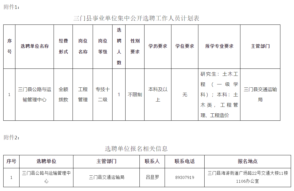 因工作需要,三门县交通运输局下属事业单位三门县公路与运输管理中心决定在全县范围内选聘财政全额拨款事业编制工作人员1名。现将有关事项公告如下:
