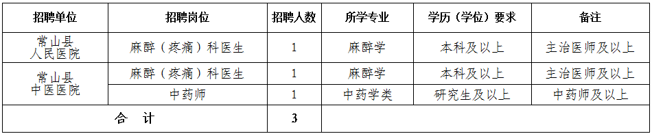 本次招聘的常山县卫健系统医疗卫生单位共2家,推出岗位3个,共招聘人员3名。具体招聘事宜详见表格。