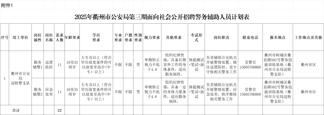 本次计划招聘2类岗位共22名警务辅助人员,具体岗位、需求人数及资格条件要求等详见《2025年衢州市公安局第三期面向社会公开招聘警务辅助人员计划表》(附件1)。
